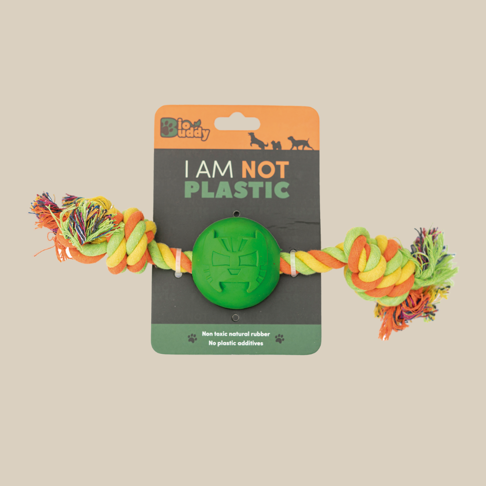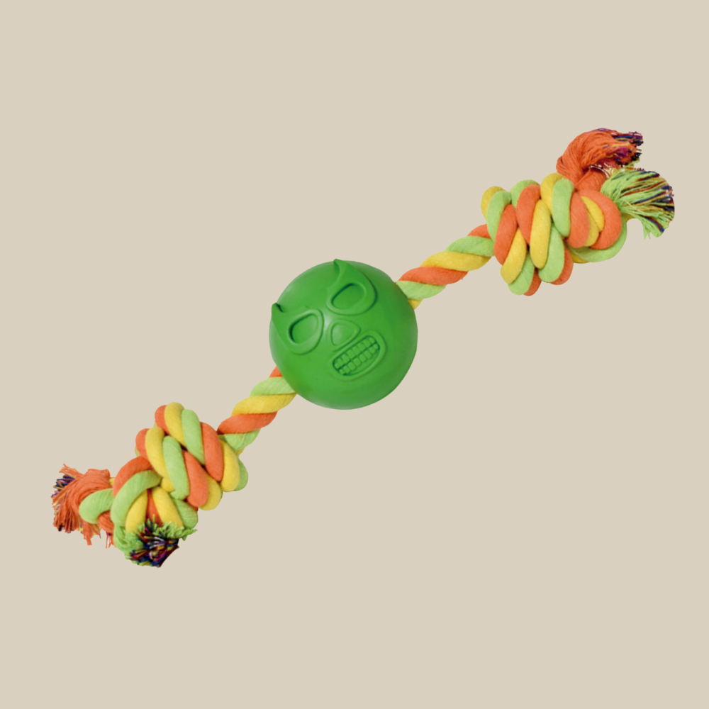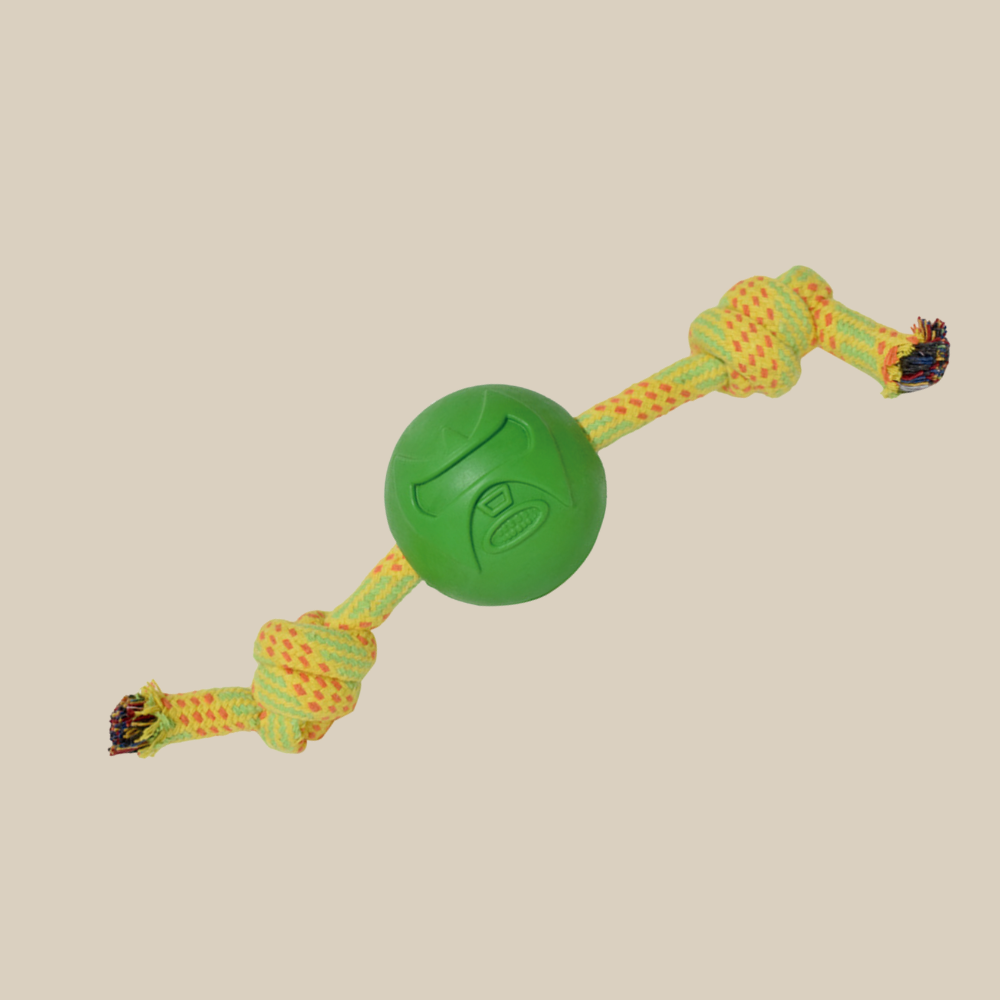 Pelota 100% hule natural con cuerda, en diseños llamativos que aportan variedad sensorial.